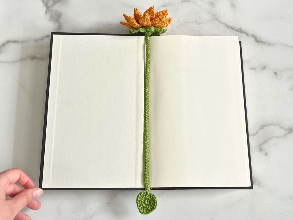 - Finished size: This bookmark is approximately 12 inches long from the top of the flower to the tip at the bottom of the leaf. The middle part between the flower and leaf is about 9.5 inches long. The flower is about 1.5 inches tall and about 3.5 inches wide. The leaf is about 1 inch long and 1 1/8 inches wide.